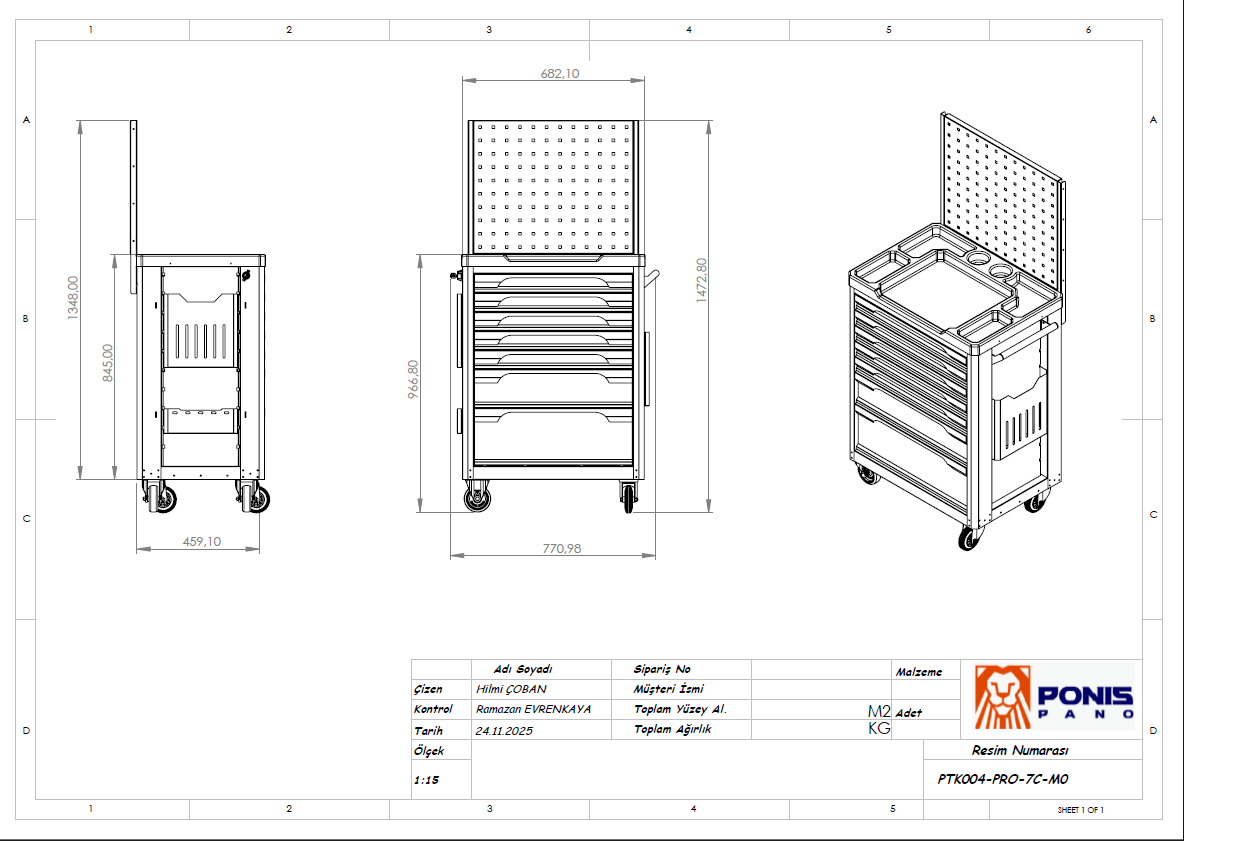 7 Çekmeceli Yanlıklı + Panolu Takım Arabası